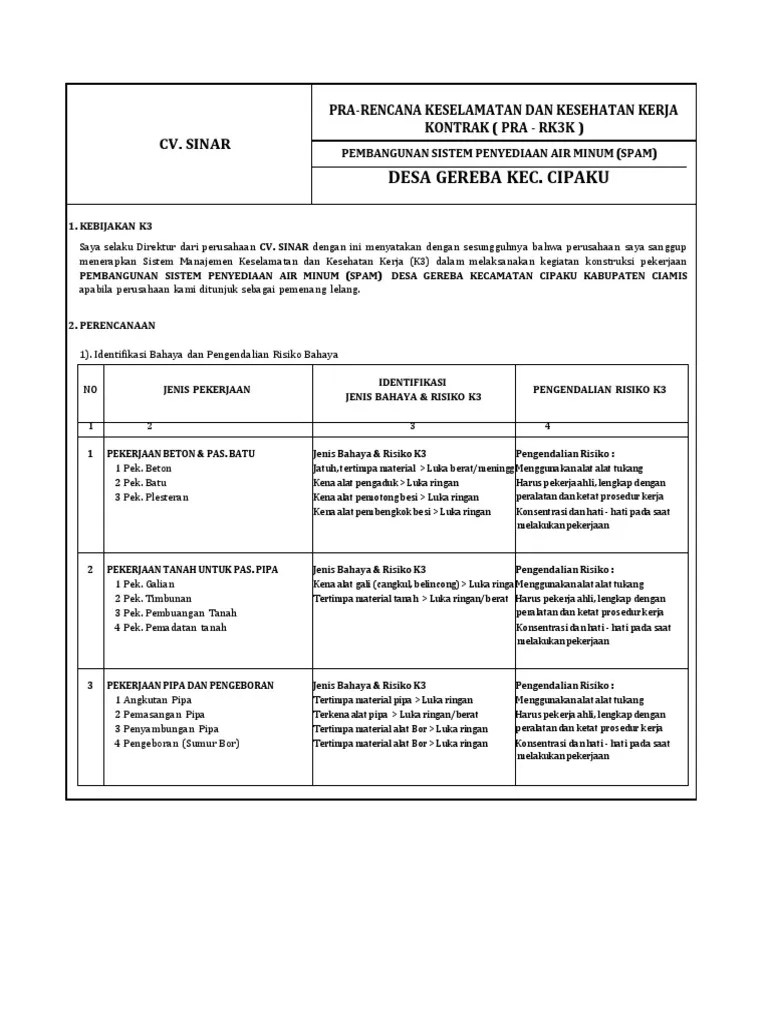Risiko yang terjadi pada pekerjaan proyek konstruksi gedung ruang. Contoh bentuk rencana keselamatan dan kesehatan kerja kontrak. Sebagai upaya meningkatkan pengendalian risiko maupun manajemen risiko dalam hal keselamatan dan kesehatan kerja (k3) di perusahaan. Formulir identifikasi bahaya penilaian risiko dan penetapan pengendalian. Contoh ibpr pekerjaan pemasangan spanduk iklan.